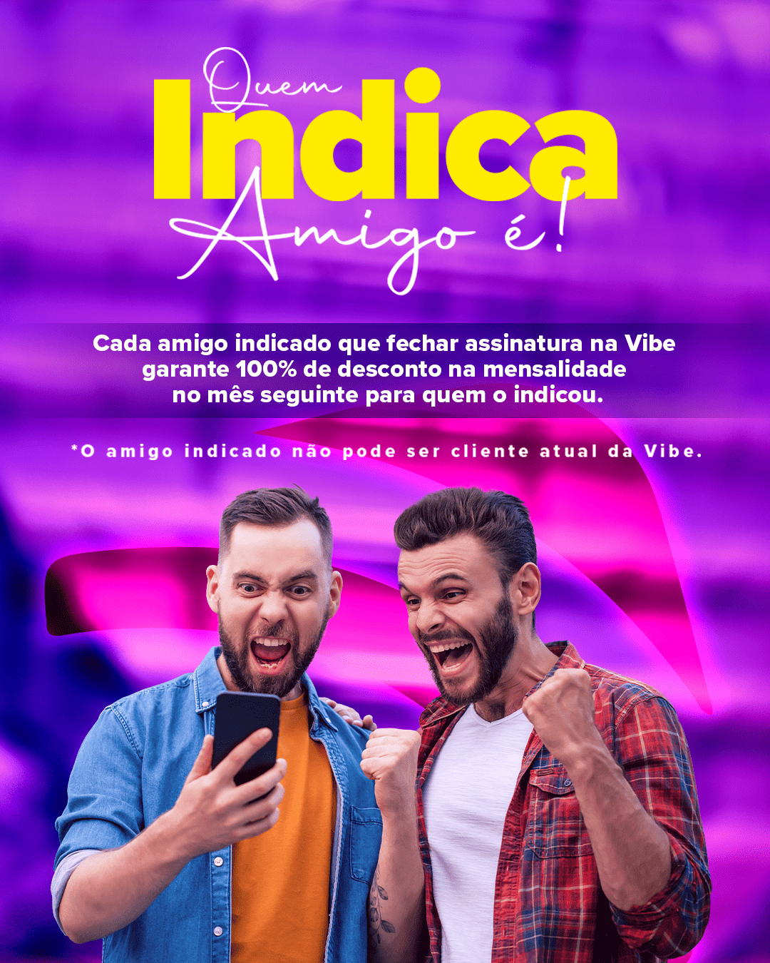 Cada amigo indicado que fechar assinatura na Vibe garante 100% de desconto na mensalidade no mês seguinte para quem o indicou.